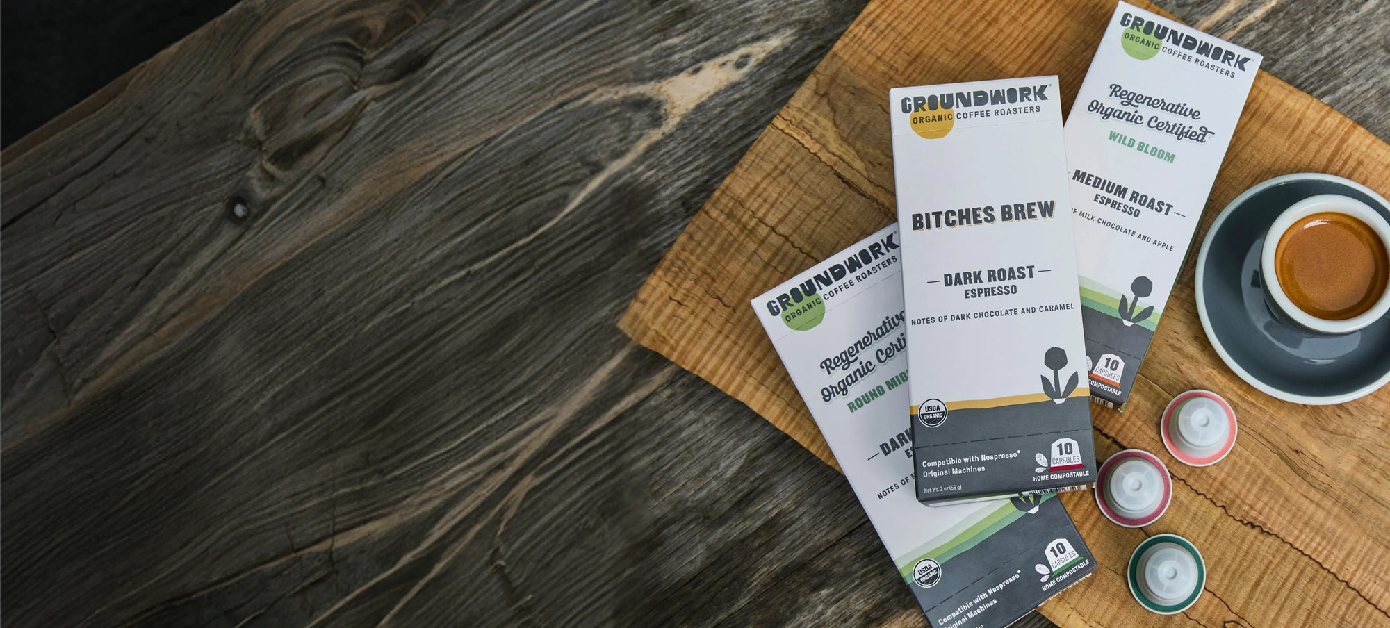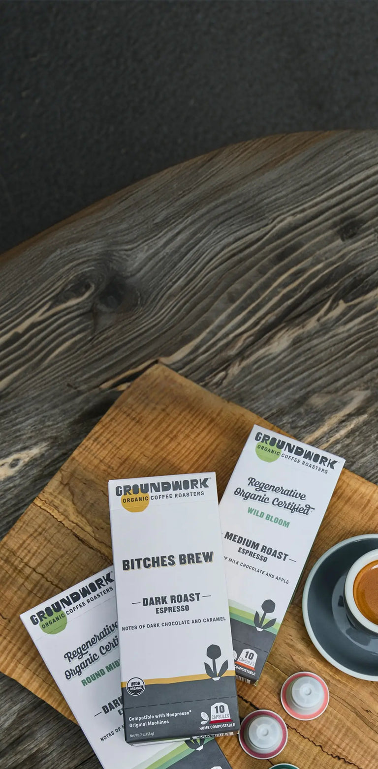 Certified organic espresso, now in aluminum-free, home compostable capsules!
